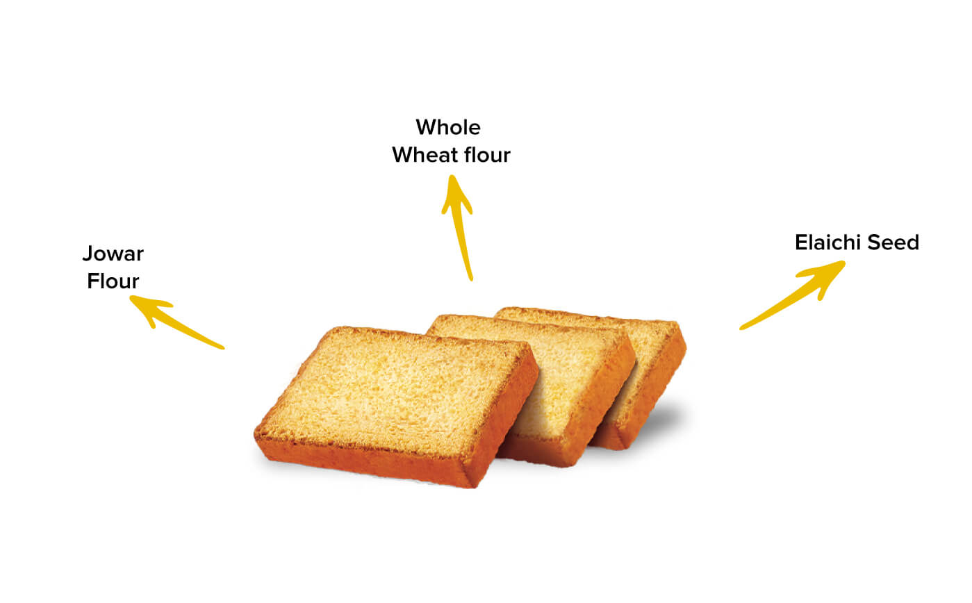 Wheat Flour (Atta), Refined Sugar, Jowar Flour (16%), Refined Palm Oil, Wheat Gluten, Baker's Yeast, Iodised Salt, Cardamom Seed (0.3%), Colour (INS 150a), Stabilizer (INS 472e), Nature-identical, Flavouring Substances, ALLERGENS: Contains Soy, Wheat.