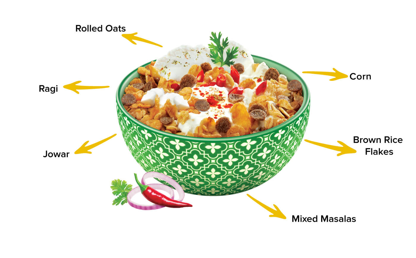 Rolled Oats (25.6%), Millets (16.3%) [Ragi (8%), Jowar (8.2%)], Corn Flakes (13%), Wheat Flakes (12.5%), Brown Rice Flakes, Rice Bran Oil, Seasoning (6%) [Refined Sugar, Spices (Pepper, Garlic, Cumin, Onion), Black Salt, Whey powder, Maltodextrin, Hydrolysed Vegetable Protein, Iodised Salt, Acidity Regulator (INS 296, INS 330), Dairy Whitener, Natural & Nature Identical Flavours, Anticaking Agent (INS 551, INS 341 (iii)], Rice Flour, Invert Sugar Syrup, Malt Extract, Refined Sugar, Honey (1%), Emulsifier (INS 322), Chilli Powder, Natural Flavour, Anticaking Agent (INS 170 (i)), Iodised Salt, Acidity Regulator (INS 330), Antioxidant (INS 320).